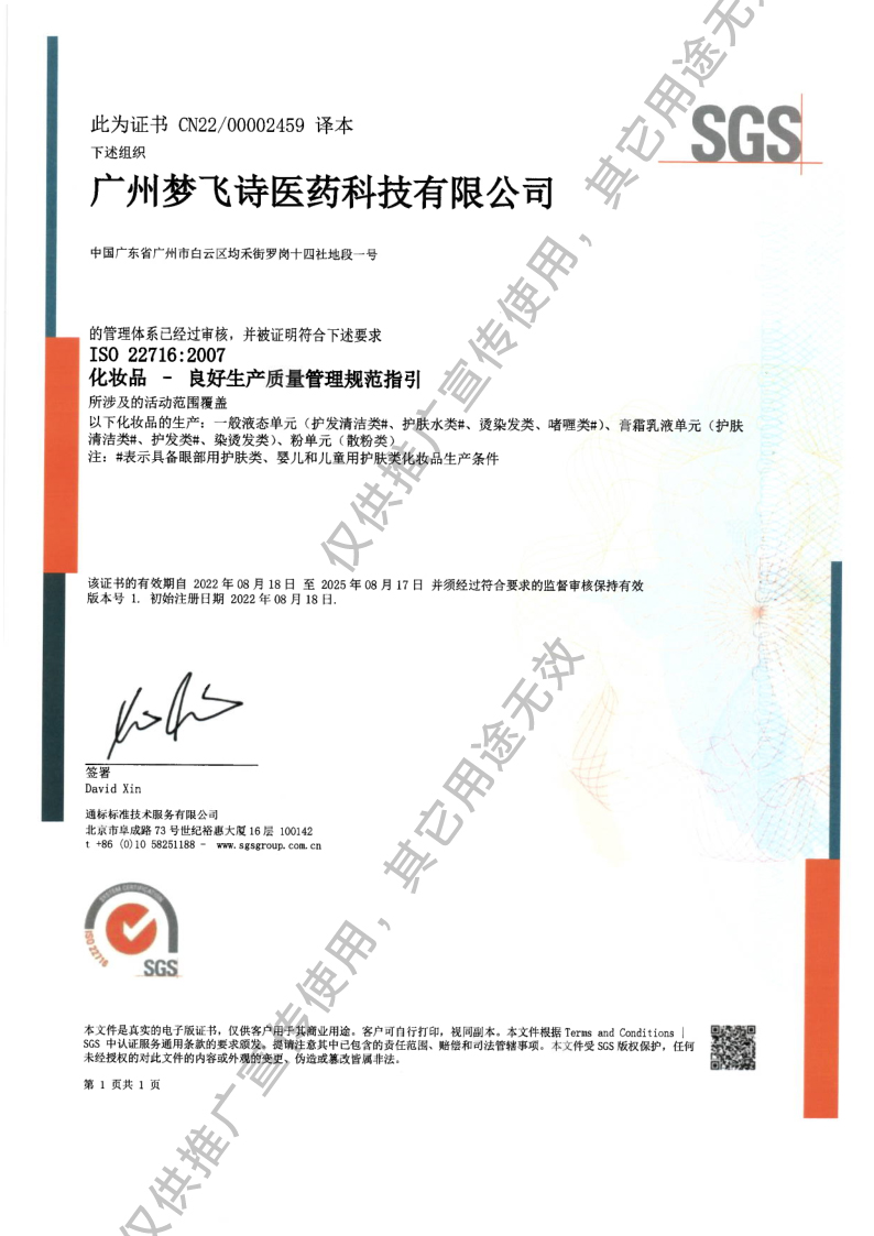 广州梦飞诗医药科技有限公司,自成立以来,一直遵循“质量第一、客户满意、持续改进、共同发展”的质量方针,实施规范化、精细化、目视化管理。其中,产品的质量管理更是遵循了广州梦飞诗医药科技有限公司对产品要求的高标准原则,每个产品在出厂前都经过微生物培养实验、防腐挑战、仪器测试、专业评测、志愿者试用、第三方独立检测等多方面的验证和测试,并加以完善,确保了产品的稳定性、有效性及安全性,完美诠释了广州梦飞诗医药科技有限公司“精于研发,卓越科技,高贵品质”的产品理念。